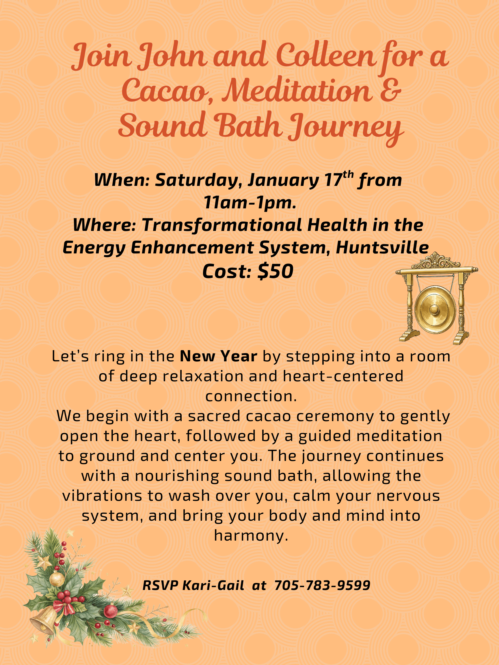 Welcome to a transformative experience designed to honor the New Year with peace and intention. Imagine stepping into a serene space where the noise of the outside world quiets and your journey inward begins. We start with a sacred cacao ceremony, an ancient ritual that invites us to open our hearts and embrace love and connection. As the warmth of cacao envelops you, we move into a guided meditation to ground and center your being, creating a foundation of calm and focus. Finally, allow yourself to be immersed in the soothing embrace of a sound bath. Let the harmonious vibrations flow over you, calming your nervous system and aligning your body and mind with the energy of renewal. Join us on this path of deep relaxation and heart-centered connection as we usher in the New Year with intention and grace.